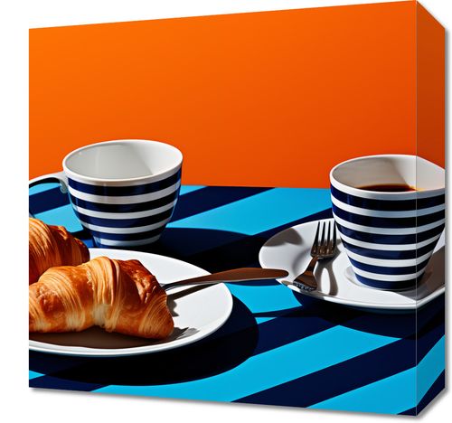 Obraz z serii wnętrza zatytułowany Croissanty. Na grafice przedstawiono elegancką aranżację śniadaniową składającą się z parujących croissantów na talerzu, towarzyszących im filiżankach kawy. Kontrastujące, nasycone kolory - głęboka, błękitna i czarna prążkowana ceramika na tle żywego, pomarańczowego tła - przyciągają wzrok i budzą apetyt. Graficzne linie stołu w niebieskich i czarnych odcieniach dodają nowoczesności i stylu. Obraz ten doskonale nadaje się do wnętrz o wyrafinowanym smaku, takich jak kuchnie, jadalnie czy kawiarnie, celebrując rytuał porannej kawy i wypieków.