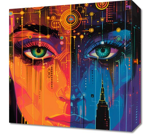 Obraz z serii abstrakcja zatytułowany Cyfrowa Psyche. Przedstawia fascynującą symetrię między ludzką urodą a technologicznym zawirowaniem. Wyraźne, zielone oczy kobiety są centralnym punktem obrazu, ożywione wizją elektronicznych obwodów i cyfrowych sygnałów, które przepływają przez i wokół jej wizerunku. Przecinające twarz linie symbolizują połączenie osobowości z nowoczesnymi technologiami, podczas gdy tło ukazuje zarys charakterystycznego krajobrazu miejskiego. Intensywne, neonowe kolory od pomarańczowego do niebieskiego nadają dziełu dynamiczny i nowoczesny charakter. Obraz ten będzie idealnym dodatkiem do współczesnych biur, salonów gier lub innych przestrzeni kreatywnych, które celebrują połączenie sztuki i technologii.