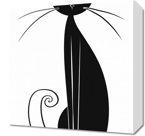 Obraz z serii abstrakcja zatytułowany Czerń Kocicy. Przedstawia minimalistyczną, stylizowaną ilustrację czarnego kota. Postać kota charakteryzuje się wydłużonym, smukłym ciałem z długimi, subtelnymi liniami, które tworzą elegancką i uproszczoną formę. Kot posiada duże, wyraziste oczy i długie wąsy, które dodają mu charakteru, a zakrzywiony ogon w kształcie spirali dodaje dynamiki kompozycji. Całość jest utrzymana w czarno-białej kolorystyce, co nadaje projektowi nowoczesnego i wyrafinowanego wyglądu. Obraz ten idealnie sprawdzi się jako dekoracja w nowoczesnych wnętrzach, wprowadzając element zaskakującej prostoty i elegancji.