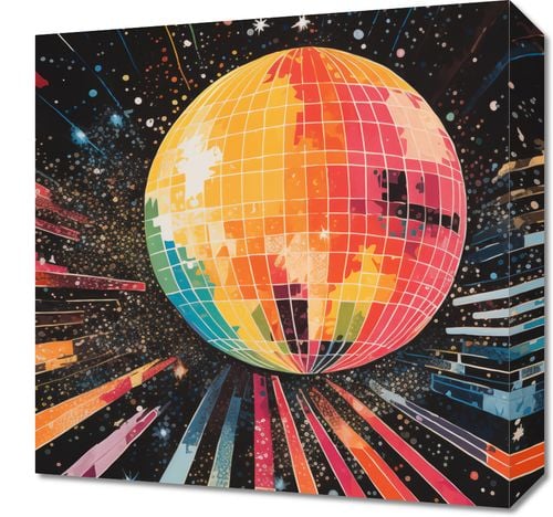 Obraz z serii pop art zatytułowany Disco Gra!. Obraz prezentuje stylizowaną dyskotekową kulę w kształcie globusu, która jest centralnym punktem kompozycji. Kulę otaczają wachlarze kolorowych promieni, które rozchodzą się na wszystkie strony, przypominając szybki ruch światła lub prędkość. Tło, przesycone ciemnymi odcieniami i przetykane jasnymi kropeczkami, może przywoływać na myśl kosmiczną przestrzeń lub nocne niebo. Barwne linie promieniujące od kuli dodają dynamiki i ruchu, a ich rozmieszczenie oraz kolorystyka nadają dziełu nowoczesny i energetyczny charakter. Obraz ten byłby idealnym akcentem w przestrzeniach rozrywkowych, takich jak kluby nocne, sale taneczne lub nawet jako żywy element dekoracyjny w domowym salonie, inspirowanym stylem retro lub miłością do muzyki.