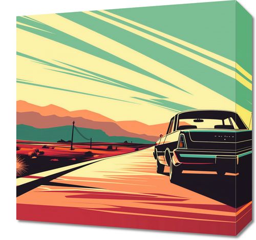 Obraz z serii pop art zatytułowany Droga przez Pustynię. Obraz przedstawia vintage samochód, prawdopodobnie model z lat 60., zaparkowany na pustynnej drodze z widokiem na zachód słońca. Złote i ciepłe odcienie nieba kontrastują z głębokimi cieniami pustyni, dodając głębi i dramatyzmu kompozycji. Design nawiązuje do złotej ery amerykańskich podróży samochodowych, przypominając o wolności i odkrywaniu nieznanych zakątków kraju. Idealnie sprawdzi się jako dekoracja w przestrzeniach inspirowanych vintage, takich jak retro kawiarnie, salony gier, domowe biblioteki, a także jako centralny punkt w salonie dla miłośników stylu mid-century modern.