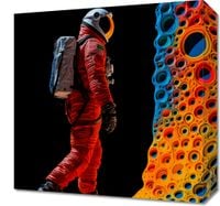 Obraz z serii pop art zatytułowany Eksplorator Nowych Światów. Na tej wizjonerskiej ilustracji przedstawiony jest astronauta w czerwonym skafandrze kosmicznym, przechadzający się po niezwykłym, abstrakcyjnym terenie, który przypomina kolorową, organiczną strukturę. Jego postać odznacza się wyraźnie na tle głębokiej czerni kosmosu, co podkreśla samotność i odwagę eksploracji nieznanych światów. Plakat ten jest celebracją ludzkiej ciekawości i pragnienia odkrywania, idealny dla miłośników astronomii, science fiction oraz jako inspirujący element dekoracyjny w przestrzeniach naukowych, edukacyjnych lub w nowoczesnych domowych wnętrzach.