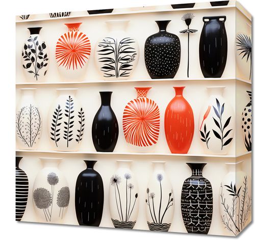 Obraz z serii wnętrza zatytułowany Gliniana Harmonia. Precyzyjnie ułożone wazony na półkach prezentują się niczym w muzeum sztuki użytkowej. Ich geometryczne i roślinne wzory, oscylujące między czernią, bielą i czerwienią, tworzą hipnotyzującą kompozycję. Prostota i elegancja tych przedmiotów, w połączeniu z ich zróżnicowaną fakturą i wzornictwem, dodają wnętrzom niepowtarzalnego charakteru. Idealnie komponują się zarówno w nowoczesnych loftach, jak i tradycyjnych pokojach kolekcjonera. Ta estetyczna kolekcja doskonale odda atmosferę w galeriach designu oraz w ekskluzywnych salonach z antykami.