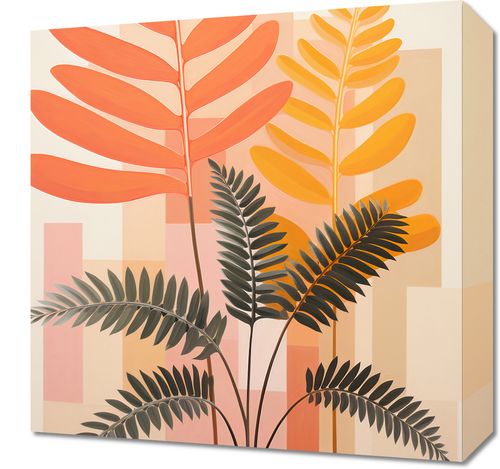 Obraz z serii wnętrza zatytułowany Harmonia Natury. Geometryczne kształty tła w delikatnych pastelowych odcieniach łączą się z organicznymi formami liści w energetycznych barwach czerwieni, żółci i zieleni. Ciemna, minimalistyczna waza stanowi mocny akcent, który spaja całość kompozycji. Ta unikalna kombinacja klasycznych i nowoczesnych elementów tworzy wizualną opowieść o równowadze i elegancji natury w urbanistycznym środowisku. Świetnie sprawdzi się w nowoczesnych biurach, w przestrzeniach artystycznych galerii czy w minimalistycznych loftach, gdzie design łączy się z naturą.