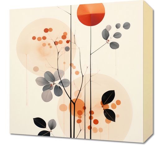 Obraz z serii wnętrza zatytułowany Jesienna Melodia. Subtelne motywy roślinne, z delikatnymi liśćmi w odcieniach niebieskiego, są otoczone przez okrągłe formy w odcieniach pomarańczy i beżu, które przypominają wschodzące słońce czy pełnię księżyca. Cienkie gałązki przecinają kompozycję, dodając jej struktury i rytmu. Ciepłe tony mieszają się z chłodniejszymi, tworząc harmonijną i spokojną całość. Jego wyrafinowany i subtelny design wprowadza atmosferę relaksu i spokoju. Idealnie pasuje do domowych salonów, gabinetów relaksacyjnych czy też nowoczesnych biur, gdzie natura łączy się z elegancją i prostotą.