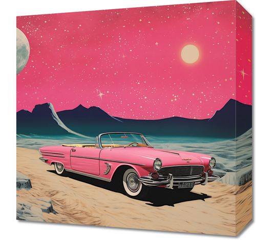Obraz z serii pop art zatytułowany Kabriolet W Kosmosie. Na pierwszym planie widzimy klasyczny, różowy kabriolet z lat 50., który zaparkowany jest na obcej planecie z surrealistycznym krajobrazem. Tło obrazu wypełnia nasycony, różowy kosmiczny pył i gwiazdy, które tworzą kontrast z jasnożółtym, blaskiem oświetlającego słońca i majestatycznym, szarym księżycem wiszącym nisko na horyzoncie. Całość tworzy niezwykłą atmosferę retro-futurystycznego odkrywania kosmosu. Obraz ten idealnie wpasuje się w przestrzenie miłośników vintage, retro designu oraz science fiction. Może ozdobić ściany kawiarni w stylu retro, nowoczesne mieszkanie czy pracownię kreatywną, dodając im niepowtarzalnego charakteru i inspirować do marzeń o przygodach w nieznanych światach.