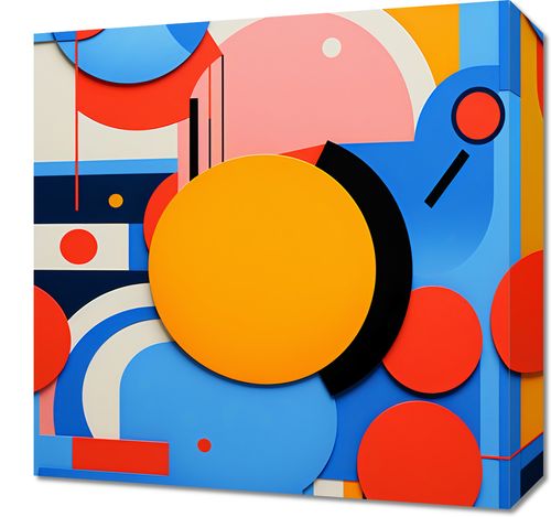 Obraz z serii geometria zatytułowany Kalejdoskop Emocji. Dynamiczna kompozycja pełna kolorowych kształtów i form przyciąga wzrok i prowokuje do refleksji. Wielowymiarowe okręgi, prostokąty i linie tworzą wizualny balet, w którym każdy element tańczy z innym w harmonii. Intensywne odcienie niebieskiego, czerwonego i żółtego kontrastują z subtelniejszymi pastelami, dodając obrazowi energii i głębi. Doskonale komponuje się w nowoczesnych biurach, kreatywnych przestrzeniach pracy oraz galeriach sztuki współczesnej.