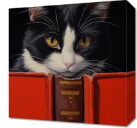 Obraz z serii wnętrza zatytułowany Koci Uczeń. Prezentuje on uroczego, czarno-białego kota z intensywnie żółtymi oczami, zaglądającego ciekawie do czerwonej, otwartej książki. Głęboki czarny tło podkreśla barwy i szczegółowe detale futra kota, a także złocenia na grzbiecie książki. Ten obraz łączy w sobie humor i ciepło, doskonale oddając osobowość i charakter kotów jako towarzyszy domowych. Idealny do umieszczenia w domowych bibliotekach, salonach czy pokojach dziecięcych, plakat ten dodaje wnętrzu przytulności i wprowadza zabawny, intelektualny element.
