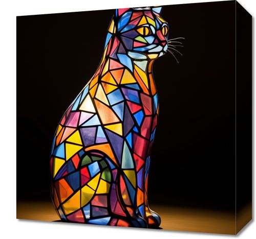 Obraz z serii abstrakcja zatytułowany Koci Witraż. Ten obraz przedstawia artystyczną ilustrację kota, który jest stylizowany na witraż. Zwierzę jest zbudowane z wielu kolorowych, geometrycznych kształtów, które przypominają szklane fragmenty witraża. Barwy są żywe i różnorodne, z przewagą odcieni niebieskiego, czerwonego, żółtego i pomarańczowego, tworząc wizualną ucztę, która zarówno przykuwa uwagę, jak i przyjemnie dla oka. Kot jest przedstawiony w profilu, siedząc z eleganckim, dostojnym położeniem, co dodaje ilustracji majestatycznego charakteru. Tło jest proste i ciemne, co pozwala na to, aby kolory kota były jeszcze bardziej wyraziste. Ta praca może być interpretowana jako hołd dla klasycznej formy sztuki, jaką jest witraż, połączony z nowoczesną grafiką cyfrową, tworząc unikalne i współczesne dzieło sztuki.