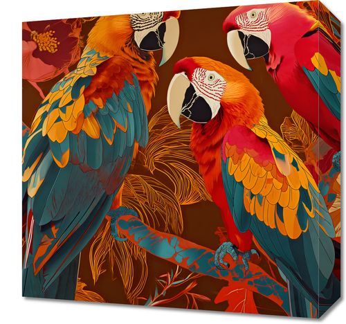 Obraz z serii abstrakcja zatytułowany Kolorowe Ary ukazuje grupę majestatycznych papug ara, których pióra w odcieniach głębokiego błękitu, gorącej pomarańczy i intensywnej czerwieni są ukazane z imponującym detalami. Ptaki są umieszczone na tle tropikalnych kwiatów i liści, tworząc barwną kompozycję, która przykuwa wzrok i przenosi obserwatora w odległe, egzotyczne krajobrazy. Dynamika i życie płynące z tego dzieła sprawiają, że jest ono idealnym wyborem dla pomieszczeń pełnych energii i pasji, takich jak kreatywne przestrzenie pracy, eklektyczne salony lub przestronne lobby hotelowe. Obraz ten celebruje różnorodność i piękno natury, przemawiając do tych, którzy cenią sobie przyrodę i kolor w swoim otoczeniu.