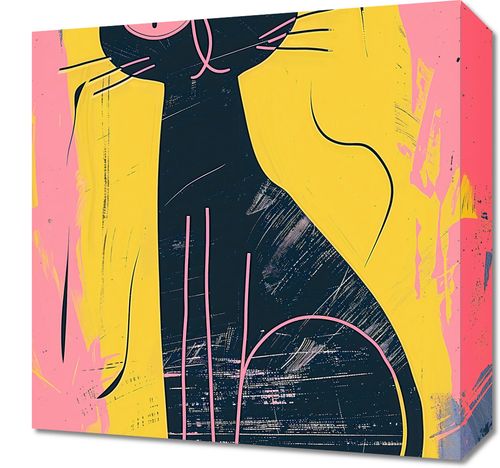 Obraz z serii abstrakcja zatytułowany Kontrastowa Kotka. Praca artystyczna przedstawia stylizowaną, abstrakcyjną sylwetkę czarnego kota na tle żywych, nieregularnych pociągnięć pędzla w odcieniach różu i żółci. Wzrok kota, zaznaczony jednym dużym różowym okiem, przyciąga uwagę i dodaje kompozycji charakteru. Mocne, geometryczne linie i intensywne kontrasty kolorystyczne tworzą nowoczesną i dynamiczną ilustrację, która przyciąga wzrok i staje się wyrazistym elementem dekoracyjnym. Obraz ten idealnie sprawdzi się w przestrzeniach miejskich, takich jak nowoczesne mieszkania, studia graficzne lub awangardowe kawiarnie, nadając wnętrzom śmiałości i wyjątkowego, artystycznego akcentu.