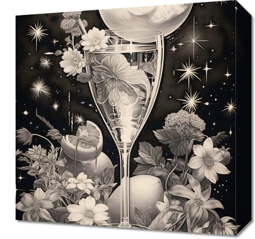 Obraz z serii wnętrza zatytułowany Kosmiczny Eliksir. Niesamowita kompozycja przedstawiająca kieliszek, z którego wylewa się galaktyczny nektar, otoczony kwiatami i roślinami w monochromatycznych barwach. Centralnym punktem jest lśniąca pełnia księżyca, której blask odbija się w szkle, tworząc atmosferę tajemnicy i magii. Gwiazdy migoczą w tle, nadając całości głębokiego, nieskończonego wymiaru. Delikatne linie i szczegóły graficzne wzbogacają kompozycję, czyniąc ją idealnym wyborem do nowoczesnych salonów, galerii sztuki oraz miejsc o tematyce astronomicznej.