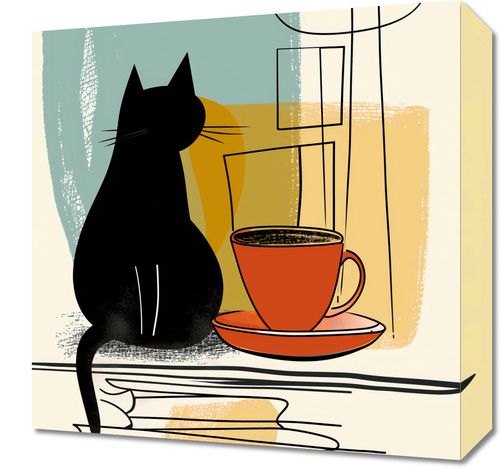 Obraz z serii abstrakcja zatytułowany Kot i Kawa. Ten pełen uroku obraz przedstawia sylwetkę czarnego kota, który wydaje się kontemplować filiżankę kawy. Stylizacja grafiki, z jej czystymi liniami i blokami kolorów w ciepłych odcieniach beżu, ochry oraz stonowanej zieleni i błękitu, tworzy atmosferę spokojnego poranka. Abstrakcyjne elementy w tle, przypominające sztukę modernistyczną, nadają plakatowi współczesnego charakteru. To dzieło sztuki idealnie pasuje do kawiarni, kuchni, a także jako subtelny akcent w nowoczesnym salonie, oferując wizualne wyrażenie komfortu i relaksu.