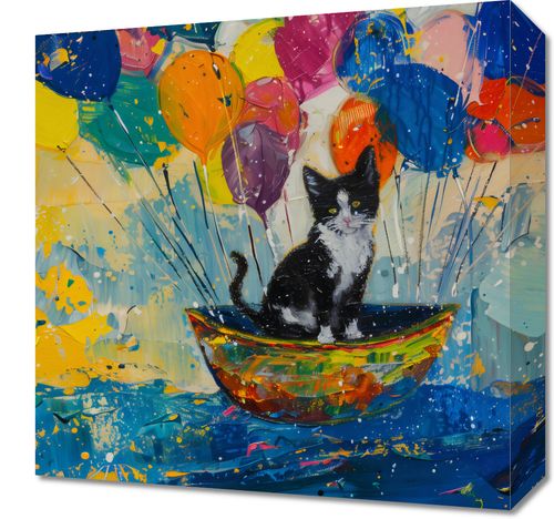 Obraz z serii abstrakcja zatytułowany Kot na Łodzi. Przedstawia on małego, czarno-białego kota siedzącego w malutkiej, kolorowej łódce, unoszącej się na żywych, błękitnych falach. Nad łódką unosi się bujny klaster jasnych, kolorowych balonów, które dodają obrazowi elementów wesołości i lekkości. Praca jest pełna energii, z widocznymi na całej powierzchni obrazu śladami energicznych pociągnięć pędzlem i plam farby, co nadaje dziełu nieco abstrakcyjny i ekspresyjny charakter. Ta mieszanka realistycznych i fantastycznych elementów tworzy ciepłą i zapadającą w pamięć scenę, która może wywoływać uśmiech i poczucie radości.