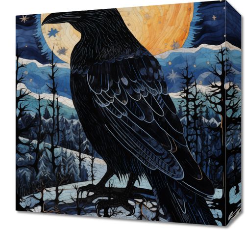 Obraz z serii abstrakcja zatytułowany Kruczy Mąciciel. Ta praca przedstawia majestatycznego kruka, który góruje nad zimowym lasem pod rozgwieżdżonym niebem. Tło, na którym widnieje wielka, pełna księżycowa aureola w złocistych i ciepłych odcieniach, kontrastuje z chłodnymi tonami niebieskiego i czerni, użytych do oddania tajemniczego krajobrazu i ptaka. Kruka cechuje szczegółowe przedstawienie piór, które dodaje tekstury i głębi, a jego silna postać emanuje spokojem i siłą. Obraz ten idealnie pasuje do przestrzeni, które celebrują naturę i jej mityczne aspekty, jak domowe biblioteki, salony w stylu eklektycznym lub pokoje z elementami boho, dodając im charakteru i wyjątkowości.