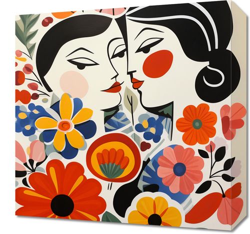 Obraz z serii wnętrza zatytułowany Kwiatowy Romans. Dwie twarze kobiety, które złączone w delikatnym spojrzeniu, otoczone są eksplozją kolorowych kwiatów i wzorów. Żywe barwy czerwieni, żółci i niebieskiego tworzą kontrast z eleganckimi konturami postaci. Czerwone plamy na policzkach dodają namiętności i życia do kompozycji, podczas gdy geometryczne wzory kwiatów wprowadzają harmonię i równowagę. Te łączone obrazy dodają nuty romansu i świeżości do każdego wnętrza. Świetnie sprawdzą się w kawiarniach, artystycznych galeriach oraz w nowoczesnych salonach, gdzie priorytetem jest kreatywność i inspiracja.