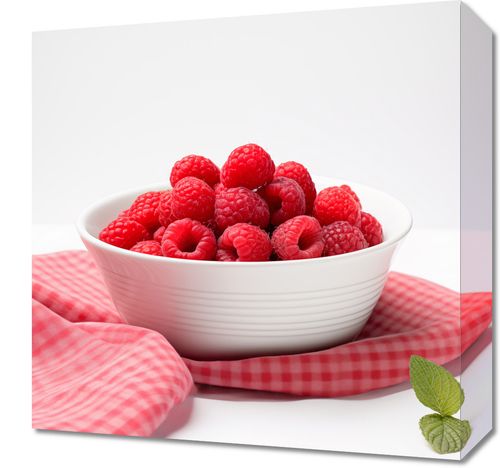 Obraz z serii wnętrza zatytułowany Lato w Misce. Na obrazie widnieje pełna misa soczystych, dojrzałych malin, które kontrastują swoją intensywną czerwienią z czystą bielą naczynia i tłem. Rozłożona obok misy czerwono-biała, kratka serwetka dodaje wiejskiego uroku, a pojedynczy listek mięty wprowadza świeży akcent. Ten obraz przyciąga wzrok swoją prostotą i elegancją, idealnie uchwycając esencję letniego sezonu i świeżości owoców. Doskonały do ożywienia kuchni, jadalni, a także jako element dekoracyjny w przestrzeniach, gdzie chce się wprowadzić nutę świeżości i naturalnego piękna. Zaprasza do celebracji zdrowego stylu życia i radości płynącej z prostych przyjemności.