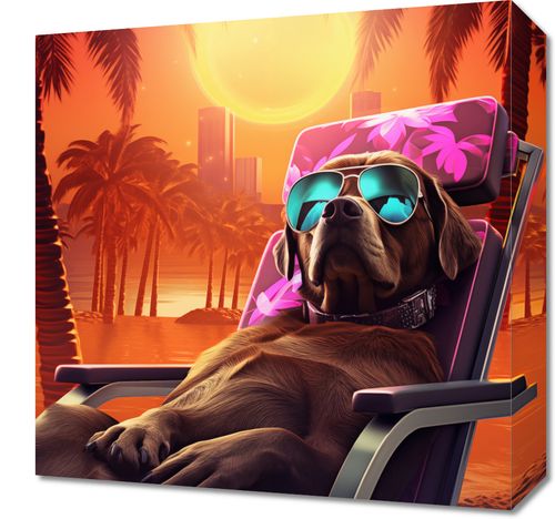 Obraz z serii pop art zatytułowany Lato w Stylu. Na tej zabawnej ilustracji widzimy psa rasy labrador, wygodnie ułożonego na leżaku plażowym, w okularach przeciwsłonecznych, z tłem zachodzącego słońca i palm. Jego relaksująca poza i luźny styl, w połączeniu z żywymi kolorami tropikalnego wschodu lub zachodu słońca, oddają atmosferę beztroskich wakacji. Obraz ten jest idealnym wyborem dla miłośników psów i letnich klimatów, świetnie nadaje się do dekoracji ścian w domach, hotelach nad morzem, czy jako dodatek do letnich barów i restauracji, wprowadzając element humoru i wakacyjnego luzu.