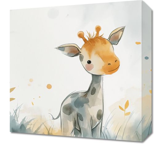 Obraz z serii wnętrza zatytułowany Mała Żyrafka. Uroczy obraz przedstawia młodą żyrafę o łagodnym spojrzeniu, wyłaniającą się z akwarelowej mgły pastelowych barw. Delikatne krople farby i subtelne linie tworzą atmosferę czystości i spokoju, nadając dziełu ciepły i relaksujący nastrój. Ten obraz, emanujący dziecięcą niewinnością i ciekawością świata, będzie idealnym dodatkiem do przestrzeni dziecięcej, takiej jak pokoje maluchów, przedszkola lub miejsca oczekiwania w placówkach pediatrycznych, zachęcając małych i dużych do marzeń i odkrywania piękna przyrody.