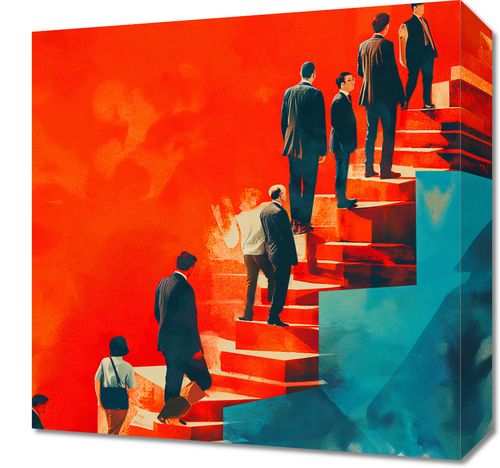 Obraz z serii abstrakcja zatytułowany Metafory Sukcesu. Przedstawia on różne postacie w formalnym ubiorze, wchodzące i schodzące po schodach, które rozdzielają się i zbiegają w różnych kierunkach. Tło obrazu jest podzielone na dwie kontrastujące strony - jedna w odcieniach czerwieni, a druga w chłodnych błękitach, symbolizując różne ścieżki i wybory w życiu zawodowym lub osobistym. Styl graficzny łączy elementy abstrakcyjne i figuralne, a silne kontrasty kolorystyczne podkreślają dynamikę i złożoność podejmowanych decyzji. Obraz ten mógłby być inspirującym dodatkiem do biura lub przestrzeni pracy, zachęcającym do refleksji nad własnym rozwojem i aspiracjami.