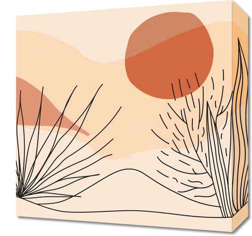 Obraz z serii boho zatytułowany Miękka Roślinność. Obraz przedstawia proste, lecz eleganckie rośliny pustynne na tle abstrakcyjnych, miękkich form i kolorów. Całość kompozycji opiera się na spokojnych odcieniach beżu, brązu oraz głębokiego terrakoty, co przywodzi na myśl ciepło i suchość pustynnego krajobrazu. Ten obraz świetnie sprawdzi się w wnętrzach o neutralnej kolorystyce, dodając im charakteru i ciepła. Idealnie nadaje się do salonu, przestrzeni wypoczynkowych lub biura, gdzie wprowadzi elementy natury i harmonii.