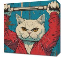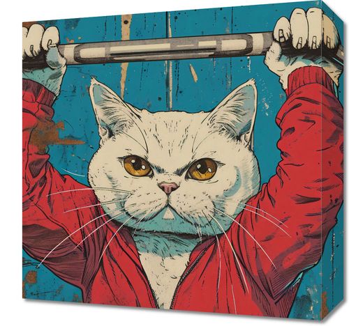 Obraz z serii motywy wschodnie zatytułowany Mistrz Ciężarów. Przedstawia on ilustrację kota w ludzkiej pozie, wykonującego podnoszenie ciężarów. Ta humorystyczna grafika w stylu vintage łączy elementy ludzkie z cechami zwierzęcymi, tworząc niezwykłe połączenie siły i uroczej nonszalancji. Kot ubrany w czerwoną bluzę sportową, z intensywnym spojrzeniem skupienia, dodaje ilustracji charakteru. Tło w starym stylu, z elementami azjatyckiego pisma, wzmaga wrażenie retro. Obraz ten idealnie wpasuje się w przestrzenie z humorem i osobowością, takie jak siłownie, pokoje gier, przestrzenie młodzieżowe lub jako zabawny akcent w domowym biurze. Dodaje on lekkiego tonu do każdego wnętrza, przypominając, że siła i determinacja mogą iść w parze z zabawą i kreatywnością.