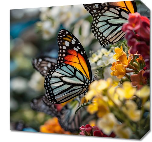 Obraz z serii natura zatytułowany Motyle Na Łące. Na obrazie widnieje trio monarchów, które z gracją spoczywają na kwitnących kwiatach, ich pomarańczowo-czarno-białe skrzydła wyłaniają się z tła pełnego barw i życia. Delikatne odcienie kwiatów w różnych odcieniach żółci, czerwieni i pomarańczy podkreślają naturalne piękno i delikatność motyli, a rozmyte tło nadaje kompozycji głębi i subtelności. Ten obraz jest celebracją życia i przemijania, idealnym do wnętrz, które pragną odzwierciedlić piękno i efemeryczność przyrody, jak salony, spa, czy pokoje wypoczynkowe.