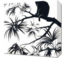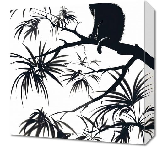 Obraz z serii wnętrza zatytułowany Na Gałęzi przedstawia sylwetkę kota siedzącego na gałęzi, zarysowaną na tle jasnego, jednolitego tła. Całość kompozycji utrzymana jest w stylu sumi-e, nawiązującym do tradycyjnej wschodniej techniki tuszem. Kontury kota i roślin są wyraziste, z delikatnymi szczegółami, które przywodzą na myśl efekt cieniowania i głębi. W tle roślinność, prawdopodobnie bambus lub tropikalne palmy, jest przedstawiona w sposób stonowany, co wskazuje na użycie gradientu cieni. Grafika ta oddaje spokój i harmonię, charakterystyczne dla azjatyckiej estetyki i sztuki. Idealnie nadawałaby się jako dekoracja w przestrzeniach inspirowanych minimalizmem i naturą.