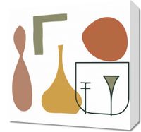 Obraz z serii boho zatytułowany Naczynia. Obraz prezentuje kolekcję abstrakcyjnych form, które przypominają różne przedmioty od naczyń po elementy dekoracyjne, tworząc estetyczną mieszankę linii i kształtów. Zestawienie spokojnych, pastelowych barw z silnymi, geometrycznymi figurami tworzy wizualnie przyjemną kompozycję, która zwraca uwagę swoją subtelną elegancją. To dzieło artystyczne jest doskonałym wyborem dla wnętrz o nowoczesnym designie, w których chcemy wprowadzić sztukę bez dominujących nad przestrzenią. Idealnie sprawdzi się jako delikatny akcent w przestronnym salonie, biurze czy jako część galerii w domowym korytarzu.