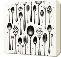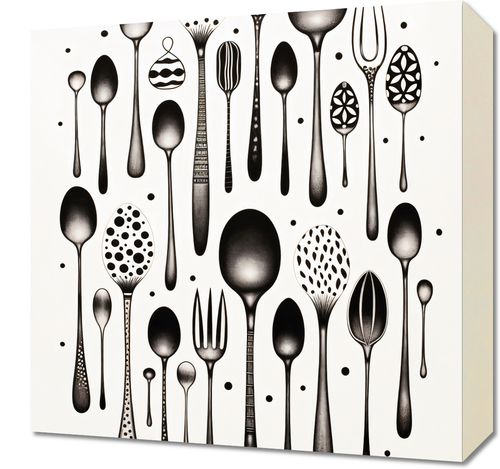Obraz z serii wnętrza zatytułowany Narzędzia Smaku. Eleganckie sylwetki sztućców w różnorodnych kształtach i wzorach, podkreślane przez subtelne detale i geometryczne punkty, tworzą harmonijną i równocześnie zaskakującą kompozycję. Czarne i białe tony nadają prostotę i wyrafinowanie, podczas gdy unikalne projekty sztućców dodają nuty kreatywności i innowacji. Idealnie sprawdzi się w nowoczesnych kuchniach, restauracjach o minimalistycznym designie oraz w przestrzeniach dedykowanych sztuce kulinarnej.
