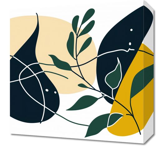 Obraz z serii minimalistyczne zatytułowany Natury Spojrzenie. Grafika jest pełna abstrakcyjnych i stylizowanych roślinnych motywów, splecionych z subtelnie przekładającymi się kształtami w tonacji beżu, czerni i musztardy. Delikatne linie dodają delikatności i ruchu, co czyni całość przyciągającą wzrok i wywołującą uczucie spokoju. Obraz idealnie nadaje się do przestrzeni, które cenią spokój i naturalną elegancję, takich jak salon czy pokój relaksu. Może także stanowić subtelny, lecz wyrazisty element w przestrzeniach biurowych, przynosząc poczucie spokoju i harmonii.