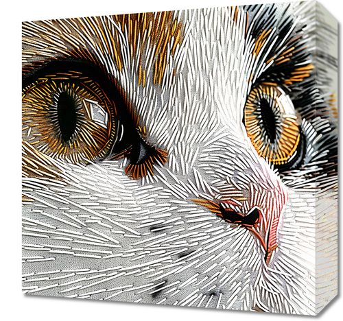 Obraz z serii abstrakcja zatytułowany Niktowany Kot. Ukazuje zbliżenie na twarz kota, wykonane z niezwykłą dbałością o detale, co sprawia wrażenie trójwymiarowości. Całość jest utrzymana w technice przypominającej szycie lub haft, gdzie każda nitka została precyzyjnie ułożona, aby naśladować naturalne linie futra. Olśniewające, złote oczy kota są pełne wyrazu i życia, przyciągają uwagę i są centralnym punktem kompozycji. Złożone z wielu warstw i kolorów linie tworzą dynamiczną i niemal hipnotyzującą teksturę. Obraz ten byłby doskonałym wyborem dla miłośników sztuki i zwierząt, wnosząc element elegancji i oryginalności do każdego wnętrza.