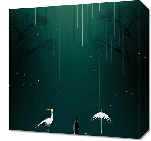 Obraz z serii wnętrza zatytułowany Nocne Marzenia. Scena przedstawia tajemniczą postać mężczyzny stojącego obok białej czapli, obaj są zanurzeni w wodzie i skierowani ku jasnoświecącemu księżycowi. Delikatne krople deszczu spadają z nieba, tworząc subtelną melodię natury, podczas gdy zarysy drzew rzucają cienie na monochromatyczne tło. Biały parasol unoszący się nad wodą dodaje elementu nieoczekiwanej magii i tajemniczości. Ta głęboka i metaforyczna kompozycja idealnie pasuje do nowoczesnych galerii sztuki, medytacyjnych przestrzeni oraz salonów czytania, gdzie cisza i kontemplacja dominują nad zgiełkiem codzienności.