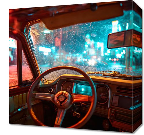 Obraz z serii pop art zatytułowany Nocny Kierowca, przedstawia widok z wnętrza klasycznego samochodu, patrząc przez deszczową, skraplaną szybę na rozświetlone neony miejskiego pejzażu nocą. Ciepłe, czerwone oświetlenie wnętrza samochodu kontrastuje z hipnotyzującym błękitem i elektrycznymi odcieniami świateł zewnętrznych, tworząc intymną, a jednocześnie dynamiczną atmosferę. Kropelki deszczu na szybie dodają tekstury i głębi, sprawiając, że scena jest zarówno realistyczna, jak i liryczna. To dzieło sztuki mogłoby znaleźć swoje miejsce w przestrzeniach nowoczesnych, miejskich loftów lub jako akcent w barze o tematyce retro, wprowadzając element tajemniczości i miejskiego romansu.
