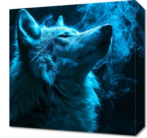 Obraz z serii natura zatytułowany Oddech Wilka przedstawia majestatycznego wilka odsłaniającego głowę ku niebu, otoczonego przez eteryczny, niebieski dym, który wydaje się być przedłużeniem jego oddechu. Sylwetka zwierzęcia jest wyraźna i dynamiczna, a jego futro jest ukazane z niesamowitą szczegółowością, każdy włos wydaje się lśnić w tajemniczym, błękitnym świetle. Dym dodaje kompozycji mistycznego klimatu, a intensywny niebieski kolor sprawia, że całość nabiera głębi i charakteru. Obraz ten doskonale sprawdziłby się jako element dekoracyjny w przestrzeniach inspirowanych naturą, takich jak domowe biblioteki, pokoje relaksu, czy studia jogi, a także jako akcent w nowoczesnych, miejskich loftach dla miłośników dzikiej przyrody i ducha wolności.