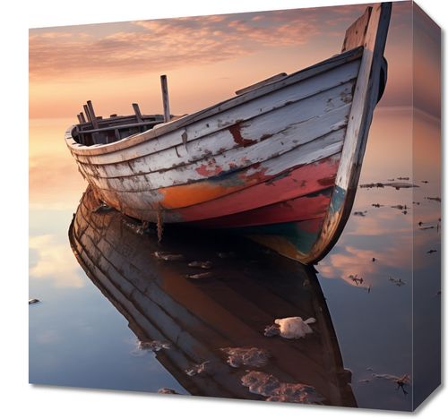 Obraz z serii pejzaże zatytułowany Odosobniona Przystań. Artystyczne zdjęcie przedstawiające opuszczoną łódź o zesztywniałych żaglach, dryfującą na spokojnych wodach przy zachodzie słońca. Odbicie łodzi w wodzie tworzy niemal doskonałe lustro, w którym łączą się niebo i morze, a zanikające kolory podkreślają upływ czasu. Złote i pastelowe odcienie zachodzącego słońca w tle nadają scenie uczucie nostalgii i spokoju. Obraz ten doskonale nadaje się do wnętrz o morskiej tematyce, takich jak nadmorskie chaty, a także jako akcent dekoracyjny w przestrzeniach, które pragną odzwierciedlić miłość do morza i żeglarstwa.