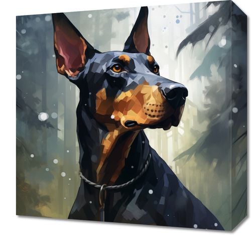 Obraz z serii abstrakcja zatytułowany Odwaga w Oczach. Ten urzekający obraz przedstawia majestatycznego dobermana, którego postawa wyraża czujność i siłę. Malownicze tło zimowego lasu, z delikatnymi płatkami śniegu spadającymi wokół, podkreśla wyraziste cechy psa. Widać w nim lojalność i odwagę, co jest typowe dla rasy. Bogata kolorystyka i technika pędzla nadają portretowi głębi i tekstury, a spojrzenie psa zdaje się być skierowane ku widzowi, tworząc bezpośrednią, emocjonalną więź. Ten obraz jest hołdem dla odwagi i piękna tych szlachetnych zwierząt, będąc idealnym akcentem dla każdego domu czy przestrzeni, które cenią sobie siłę i towarzystwo psów.