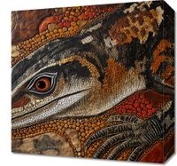 Obraz z serii abstrakcja zatytułowany Oko Jaszczurki. Fascynujące dzieło sztuki przedstawia zbliżenie na oko jaszczurki, które jest wykonane z niezwykłą dbałością o detale. Bogata faktura skóry zwierzęcia oraz użycie techniki przypominającej pointylizm sprawiają, że obraz zyskuje trójwymiarową głębię i realizm. Dynamiczna paleta barw, od głębokich odcieni brązu po złote i pomarańczowe akcenty, podkreśla dziką i pierwotną esencję natury. Obraz ten idealnie wpasuje się w dekoracje wnętrz o tematyce przyrodniczej, jak również stanowić może wyrazisty element w przestrzeniach edukacyjnych, takich jak sale biologiczne czy przyrodnicze, a także jako elegancki akcent w przestrzeniach mieszkalnych dla miłośników natury i dzikiej fauny.