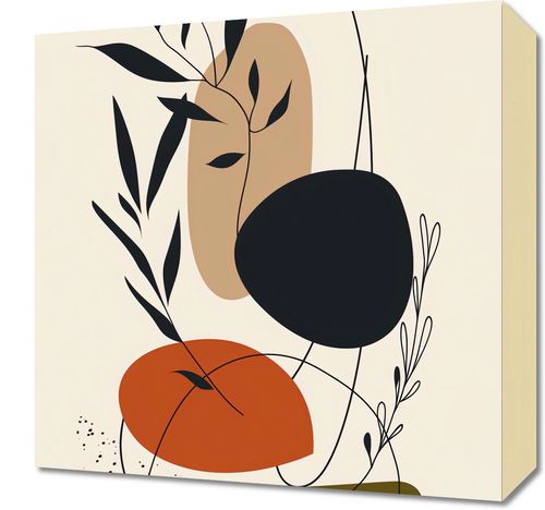 Obraz z serii minimalistyczne zatytułowany Orszak Natury. Kompozycja ta wyraża subtelny urok abstrakcji, przywołując na myśl symbiozę sztuki i natury. Użycie ograniczonej palety kolorystycznej, obejmującej zielenie, czerwienie, czernie i beże, dodaje pracę ciepła i naturalności, a zarazem utrzymuje jej prostą elegancję. Linie są zarówno płynne, jak i geometryczne, co tworzy interesujące przeciwstawienie i zachęca do refleksji nad formami w naturze. Owa grafika może wnieść spokój i równowagę wizualną do każdej przestrzeni, będąc zarówno delikatnym uzupełnieniem, jak i głównym punktem zainteresowania.