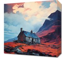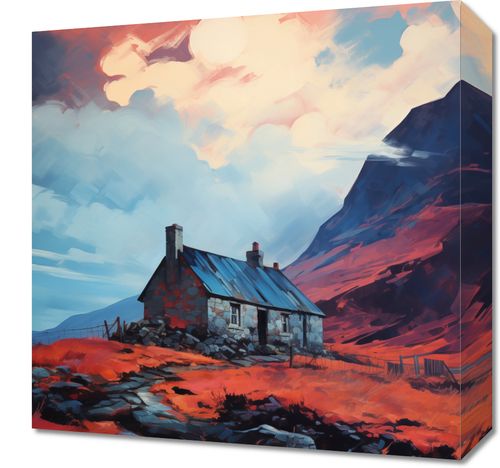 Obraz z serii pejzaże zatytułowany Ostatni Bastion. Obraz przedstawia osamotniony domek umiejscowiony w surowym, ale majestatycznym krajobrazie, pod dramatycznym niebem o intensywnych odcieniach czerwieni i błękitu. Zmierzch słońca rzuca ciepłe światło na dzikie, wrzosowe pola, tworząc kontrast z chłodnymi tonami górskiego tła. Ten obraz wyraża surowe piękno i niezłomność natury, a także ludzką tęsknotę za prostotą i ciszą. Idealnie nadaje się do wnętrz, które pragną wprowadzić poczucie spokoju, odosobnienia i kontemplacji natury.