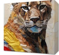 Obraz z serii wnętrza zatytułowany Papierowy Tygrys. Ta oryginalna i kreatywna ilustracja przedstawia portret tygrysa wykonany techniką kolażu z kolorowych kawałków papieru. Wykorzystanie różnych odcieni i tekstur papieru nadaje dziełu głębi i dynamiki, a jednocześnie zachowuje realistyczny obraz dzikiego zwierzęcia. Obraz ten jest wyjątkowym dziełem sztuki, które przyciąga wzrok i inspiruje, idealny dla miłośników natury i oryginalnego designu, świetnie sprawdzi się w nowoczesnych salonach, gabinetach lub jako wyrazisty akcent w przestrzeniach publicznych takich jak galerie sztuki czy kawiarnie.