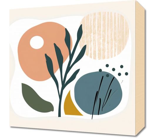 Obraz z serii boho zatytułowany Pastel Owoców.Obraz przedstawia stilizowany obraz natury, gdzie organiczne formy i kształty łączą się w nieoczywisty sposób. W kompozycji dominuje duża, pastelowa forma przypominająca owoce lub słońce, która kontrastuje z subtelnym tłem w delikatnych odcieniach beżu ozdobionym wertykalnymi liniami. Obok widnieją płynne, ciemnozielone liście oraz zaokrąglone, geometryczne formy w odcieniach szarości i musztardy, uzupełnione o subtelne graficzne akcenty. Obraz będzie pięknie komponował się w przestrzeniach poszukujących elementów natury w abstrakcyjnej, uproszczonej formie, idealnie nadając się do nowoczesnych salonów, kreatywnych przestrzeni pracy lub jako delikatny akcent w minimalistycznej sypialni.