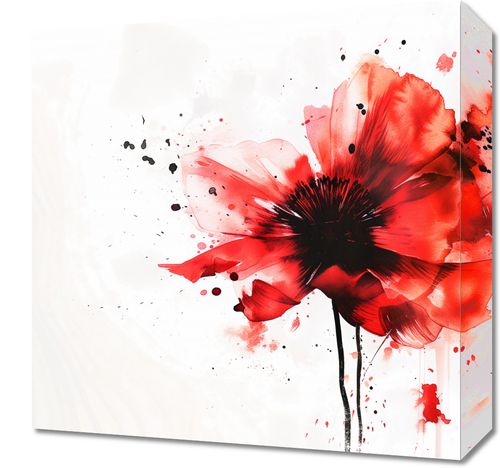 Obraz z serii abstrakcja zatytułowany Płynna Akwarela. Na obrazie przedstawiony jest kwiat w stylu akwarelowym, z dominującą czerwoną paletą barw, która przechodzi w mocne akcenty czerni w centrum kwiatu. Obraz ma dynamiczny i spontaniczny charakter, co podkreślają rozbryzgi i krople farby rozchodzące się wokół kwiatu. Przypomina to efekt plamy, który dodaje kompozycji artystycznego wyrazu i energii. Kontrast między delikatnymi czerwieniami a głęboką czerń centrum kwiatu przyciąga wzrok i czyni obraz bardzo wyrazistym. Tło jest jasne z subtelnie zaznaczonymi plamami, co dodatkowo akcentuje dramatyzm i piękno przedstawionego kwiatu.