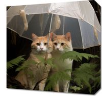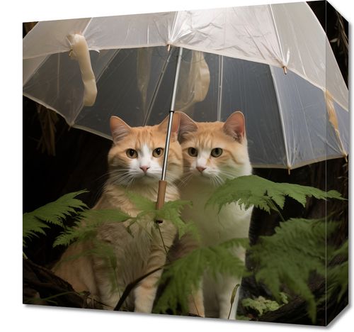 Obraz z serii wnętrza zatytułowany Podwójna Ochrona przedstawia dwie urocze, rude koty szukające schronienia pod przezroczystym parasolem, który zdaje się być koroną zielonej paproci. Ich symetryczne odbicie w połyskliwej strukturze parasola dodaje głębi i charakteru kompozycji. Ciepłe odcienie futra kotów kontrastują z ciemnym, zielonym tłem, co sprawia, że stają się centralnym punktem obrazu. Ich spojrzenia są skierowane prosto w obiektyw, co nadaje fotografii osobisty i intymny charakter. To zdjęcie idealnie uchwyciło moment spokoju i ochrony w naturalnym otoczeniu, a zarazem subtelnie podkreśla więź między dwoma zwierzętami. Idealne do wnętrz o domowym, ciepłym charakterze, zarówno dla miłośników kotów, jak i miłośników przyrody.