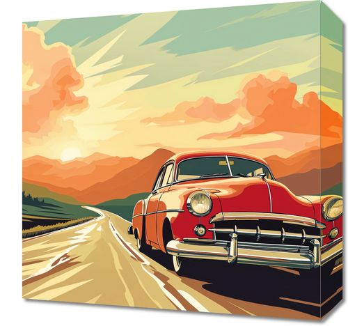 Obraz z serii pop art zatytułowany Przygoda Czeka. Ilustracja przedstawia klasyczny czerwony samochód z lat 50-tych, który wyrusza w podróż wzdłuż malowniczej, pustej drogi prowadzącej ku zachodzącemu słońcu. Dramatyczne chmury i rozświetlone niebo tworzą tło dla tego zapierającego dech w piersiach krajobrazu. Sceneria jest nasączona barwami zachodu słońca, od ciepłych żółci po głębokie pomarańcze, tworząc poczucie przygody i niekończących się możliwości. Obraz ten doskonale sprawdzi się w stylowym salonie, biurze, a nawet w garażu entuzjasty klasycznych samochodów, inspirując do marzeń o podróży i odkrywaniu nowych miejsc.