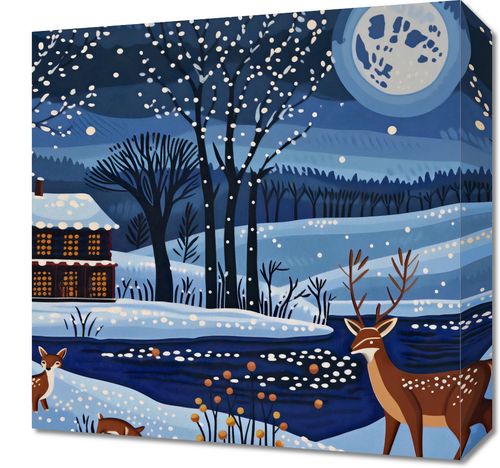 Obraz z serii abstrakcja zatytułowany Przyszła Zima. Obraz przedstawia malowniczą, zimową scenę w stylistyce folklorystycznej. Na obrazie dominują chłodne odcienie niebieskiego, tworząc nocny krajobraz pokryty śniegiem. Centralny motyw stanowi dom z oświetlonymi oknami, co nadaje scenie ciepły, przytulny akcent. Śnieg delikatnie opada na drzewa i dach domu, a pełnia księżyca rozświetla niebo, odbijając się w zamarzniętym strumieniu. Na pierwszym planie widać sylwetki zwierząt: dorosłego jelenia i młodego lisa, które dodają kompozycji naturalnego życia i ruchu. Tło przedstawia malownicze wzgórza i lasy, co współgra z idyllicznym, spokojnym nastrojem obrazu. Scena ta wywołuje uczucie spokoju i cichej radości, sprawiając, że plakat ten jest idealny do dekoracji wnętrz w zimowym okresie, dodając im ciepła i uroku.