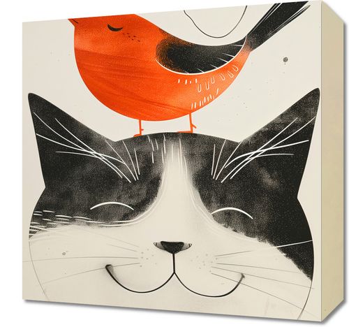 Obraz z serii abstrakcja zatytułowany Pyzaty Przyjaciel przedstawia uroczą, minimalistyczną ilustrację czarno-białego kota z zamkniętymi oczami i szerokim uśmiechem, na którego głowie spoczywa radosny, czerwony ptaszek. Kot ma charakterystyczne białe obszary wokół pyszczka, na którym wyraźnie rysują się czarne wąsy i delikatny nos. Ptaszek wydaje się być zadowolony, śpiewający, z zamkniętymi oczkami, co dodaje kompozycji wesołego i spokojnego nastroju. Tło jest jasne, z subtelnymi plamami i kropkami, które mogą imitować subtelny efekt spękanego płótna lub papieru. Po lewej stronie, na górze, widoczna jest wschodnia pieczęć, co nadaje pracy szczyptę orientalnego charakteru. Ta grafika mogłaby być idealnym, ciepłym dodatkiem do przestrzeni domowej, zwłaszcza do pokoju dziecka lub jako element dekoracyjny w przestrzeni wspólnej, przynoszący uśmiech i poczucie spokoju.