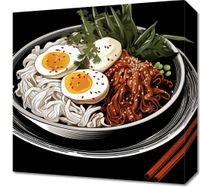 Obraz z serii wnętrza zatytułowany Ramen w Sztuce. Ta apetyczna ilustracja przedstawia klasyczną miskę ramenu, w której harmonijnie komponują się ułożone białe nudle, soczyste półmiski jajka, pikantne kiełki i świeże zielone warzywa, wszystko oprawione w wyraziste akcenty sosu i przypraw. Intensywne kolory i precyzyjne detale rysunku, od czerwonych pałeczek po lśniące składniki, celebrują estetykę i smak tradycyjnego japońskiego dania. Plakat ten wniesie do każdej przestrzeni, od kuchni po jadalnie, ducha nowoczesnego designu i miłości do kulinarnych przyjemności.