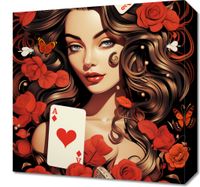Obraz z serii abstrakcja zatytułowany Różany Hazard. Ta bogato zdobiona grafika przedstawia portret kobiety z królewskim spokojem, otoczoną przez wirujące karty z sercami i rozkwitające czerwone róże. Jej włosy płynnie przechodzą w kwiatowe motywy, a spojrzenie jest pełne tajemnicy i uroku. Motyle i drobne perełki dodają kompozycji element fantazji i delikatności. Wszystko to na tle głębokiej czerni, która eksponuje intensywność kolorów i detali. Obraz ten jest idealny dla przestrzeni, które chcą dodać element romantyzmu i wyrafinowania, jak eleganckie sypialnie, prywatne kolekcje czy luksusowe salony. Jego barwna paleta i symboliczne elementy sprawiają, że jest to dzieło, które przyciąga wzrok i pobudza wyobraźnię. BLEJTRAMABlejtrama, na którą naciągane jest płótno, wykonana jest z naturalnego drewna sosnowego. To mocne i solidne drewno stanowi jedno z najbardziej ekologicznych rozwiązań, gdyż jest łatwe w obróbce. Dodatkowym atutem jest fakt, że sosna rośnie w Polsce, co gwarantuje lokalną obróbkę materiału. Obraz na takiej blejtramie jest trwały i wytrzymały. Ramki do zdjęć nie są wliczone w cenę wydruku. Jeśli chcesz je nabyć, prosimy o dokonanie zakupu oddzielnie.ZADRUKOWANE BOKIKażdy egzemplarz charakteryzuje się zadrukowanymi bokami, co umożliwia zawieszenie obrazu na ścianie bez potrzeby dodatkowej oprawy.