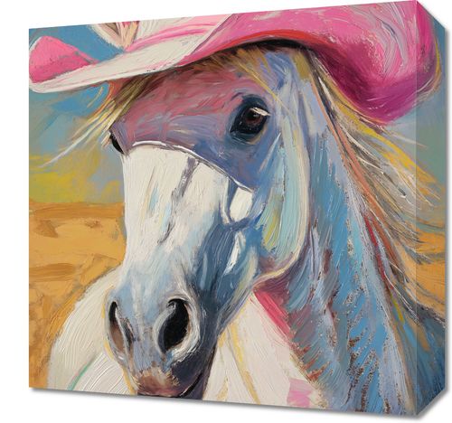 Obraz z serii pop art zatytułowany Różowy Kapelusz to barwna i pełna życia ilustracja przedstawiająca portret konia w różowym kapeluszu kowbojskim. Wyraźne, dynamiczne pociągnięcia pędzla i bogata paleta barw nadają obrazowi wrażenie ruchu i żywiołowości. Tło w ciepłych odcieniach żółci i błękitu podkreśla sylwetkę konia, a różowy kapelusz dodaje humorystyczny, ale i elegancki akcent kompozycji. Obraz ten idealnie nadawałby się do dekoracji wnętrz z charakterem, takich jak westernowe bary, restauracje z amerykańską tematyką, pokoje młodzieżowe czy inne przestrzenie, które chcą wprowadzić element zabawy i niekonwencjonalności.